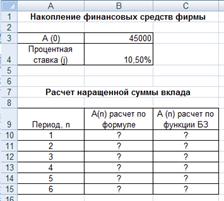 с помощью формулы А(n)=А(0) * (1+j)n (в ячейку B10 ввести формулу =$B$3*(1+$B$4)^A10 или использовать функцию СТЕПЕНЬ);