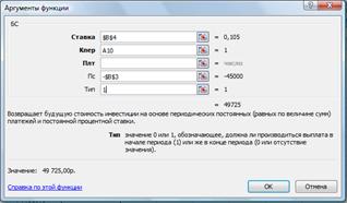 Синтаксис функции БС: БС (ставка; кпер; плата; нз; тип), где ставка – это процентная ставка за период; кпер – это общее число периодов выплат годовой ренты; плата – это выплата, производимая в каждый период, вводится со знаком «-», это значение не может меняться в течение всего периода выплат. Обычно плата состоит из основного платежа и платежа по процентам, но не включает других налогов и сборов; нз – это текущая стоимость, или общая сумма всех будущих платежей с настоящего момента. Если аргумент нз опущен, то он полагается равным 0. В этом случае должно быть указано значение аргумента плата; тип – это число 0 или 1, обозначающее, когда должна производиться выплата. Если аргумент тип опущен, то он полагается равным 0 (0 – платеж в конце периода; 1 – платеж в начале периода).