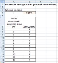 Задание 3. Сравнить доходность размещения средств организации, положенных в банк на один год, если проценты начисляются m раз в год, исходя из процентной ставки j = 9,5% годовых (рис. 9); по результатам расчета построить график изменения доходности инвестиционной операции от количества раз начисления процентов в году (капитализации).