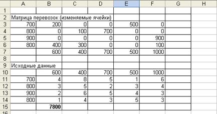 В матрице перевозок содержатся оптимальные объемы поставок грузов от поставщика потребителям, дающие минимум затрат на доставку. Значение целевой функции содержится в ячейке В15 и для конкретной задачи равно 7800. Из вышеизложенного можно сделать следующий вывод: минимум затрат на доставку нефтепродуктов, равный 7800 условных денежных единиц, будет обеспечен при следующем плане поставок: