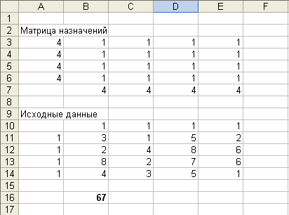 В конкретном примере осуществляется ввод условной мощности работника фирмы (в ячейки А11:А14 вводится «1»), потребности в заполнении вакантной должности («1» - в В10:Е10), ввод производительности труда конкретного работника при проведении контрольных испытаний по каждой должности (блок В11:Е14).