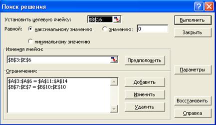 · в строке Ограничение введем адреса (или укажем на листе) $В$10:$E$10;
