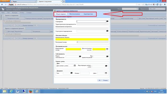 Для ввода и редактирования данных применяются различные объекты интерфейса (Рис. 3.1.6), позволяющие ввести значение с клавиатуры или выбрать из классификаторов. Все используемые объекты интерфейса представлены в Табл. 1, формы содержат разные вкладки содержащие различные поля для описания соответствующих характеристик объекта, для перехода между вкладками необходимо однократно нажать левой кнопкой мыши на соответствующую вкладку (рис. 3.1.6)