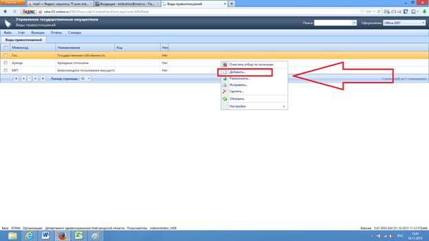 Для добавления в словарь новых значений необходимо навести курсор мышки активное поле (Рис.3.1.9.), и нажать правую кнопку мыши. При этом открывается контекстное меню (Рис. 3.1.10.) в котором следует выбрать пункт добавить и нажать на выбранный пункт левой кнопкой мыши.