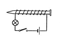460 | Изготовить простейший электромагнит, намотав на железный гвоздь 70-100 витков тонкого изолированного провода. Собрав цепь (см. рис.), определить магнитные полюса у электромагнита. Ответ проверить магнитной стрелкой. Показать как изменить полюса у этого электромагнита.