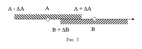 При проверке законов, имеющих вид равенства A=B, признаком достоверности является пересечение интервалов [A+DA] и [B+DB] (рис. 3). Если, при проверке законов, оценку погрешности произвести трудно, то можно рассчитать отношение A/B от 1. Тогда разность |A/B-1| позволяет сделать заключение о качестве экспериментальной проверки равенства A=B, т. е. принять за e». [1 стр. 7]
