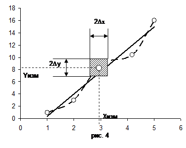 «Часто итоги эксперимента представляют графически. В результате измерений величин x и y мы получаем не точку, а область со сторонами 2Dx и 2Dy. Поэтому проводить линию надо через эти области. Например, если известно, что закон распределения измеряемой величины имеет линейный характер (см. рис. 4), то штриховая линия на рисунке будет являться неправильной.