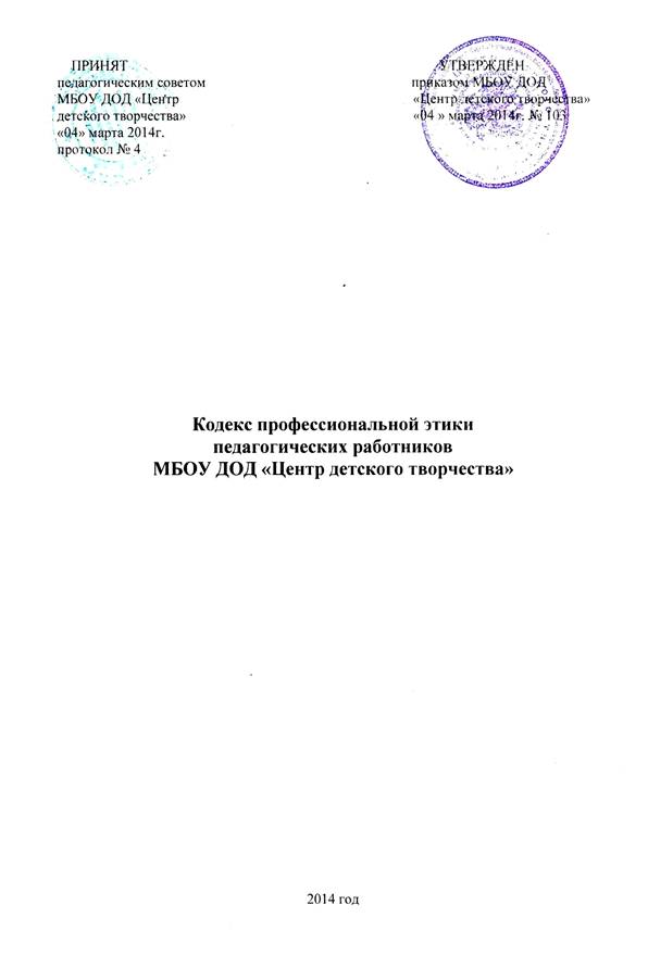 1.2. Кодекс является составной частью документов, регламентирующих отношения участников образовательного процесса и досуговой деятельности (обучающихся, педагогических работников, администрации, семьи): Устава, Коллективного договора Правил внутреннего трудового распорядка, должностных инструкций и соглашений МБОУ ДОД «Центр детского творчества». Также основан на иных нормативных правовых актах и общепринятых нравственных принципах и нормах Российского общества и государства.