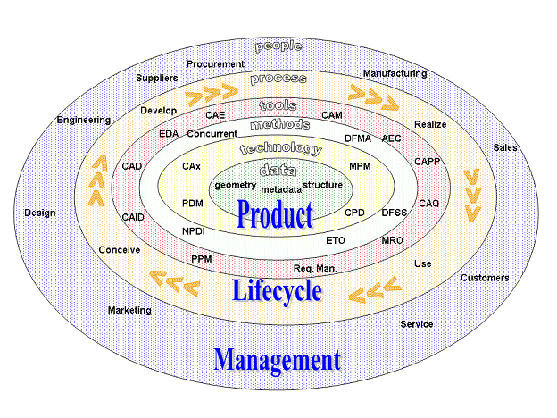 Ядро PLM (управление жизненным циклом продукта) находится в создании и центральном управлении всеми данными о продукте, и технология использовала получать доступ к этой информации и знаниям. PLM как дисциплина появился из инструментов, таких как CAD, CAM и PDM, но может быть рассмотрен как интеграция этих инструментов с методами, людьми и процессами в течение всех стадий жизни продукта. Это не примерно разработка программного обеспечения, но является также бизнес-стратегией.