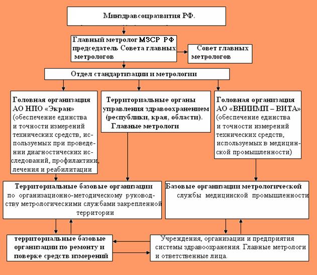 В системе Минздравсоцразвития РФ создана специальная служба - метрологическая служба здравоохранения, в задачу которой входит обеспечение единства измерений и однообразия средств измерения, используемых в различных областях теоретической и практической медицины, которая работает в тесном контакте с Федеральной службой по техническому регулированию и метрологии и является единой для всех учреждений здравоохранения. Государственный надзор за деятельностью метрологической службы Минздравсцразвития России осуществляет Федеральная служба по техническому регулированию и метрологии и ее территориальные органы.