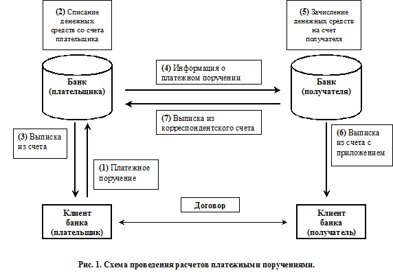 Процедура расчетов по платежному поручению состоит в выполнении операций по зачислению и списанию денежных средств на счетах банков и их клиентов, соответствующих платежному поручению (на рисунке прямоугольники с номерами 2 и 5).