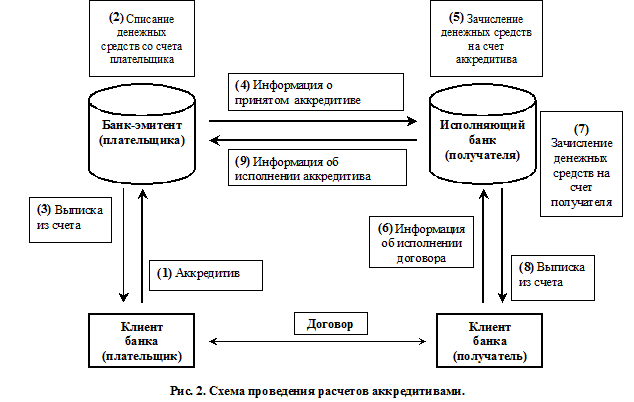 При расчетах по аккредитиву банк, действующий по поручению плательщика об открытии аккредитива (банк-эмитент), обязуется произвести платежи в пользу получателя средств по представлении последним документов, соответствующих всем условиям аккредитива, либо предоставить полномочие другому банку (исполняющий банк) произвести такие платежи. В качестве исполняющего банка может выступать банк-эмитент, банк получателя средств или иной банк. Схема проведения расчетов аккредитивами приводится на рис. 2.