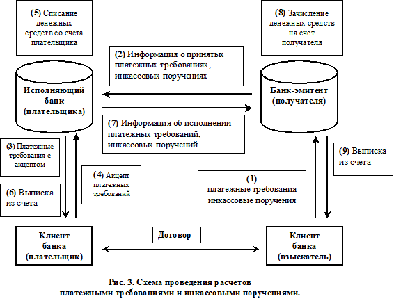 Процедуры расчетов по платежным требованиям и инкассовым поручениям состоят в выполнении операций по зачислению и списанию денежных средств на счетах банков и их клиентов в соответствии с реквизитами, указанными в расчетных документах (на рисунке прямоугольники с номерами 5 и 8).