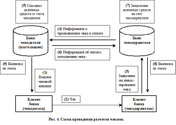 Реквизиты чека, форма чека и порядок его заполнения определяются законом и установленными в соответствии с ним банковскими правилами. Схема проведения расчетов чеками приводится на рис. 4.