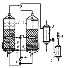 Аппаратурное оформление технологической схемы вакуумного способа экстрагирования включает: два спаренных экстрактора 1, 2, конденсатор-холодильник 3, вакуум-насос 4, сборник 5, теплообменники 6, центробежный насос 7, ложное перфорированное днище 8, систему трубопроводов и запорной арматуры (рис. 4.50).