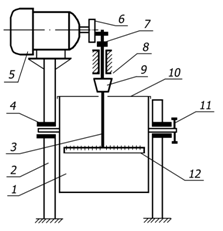 На рис. 4.51 представлен экстрактор с вибрационной насадкой периодического действия для экстрагирования плодово-ягодного сырья, свежего, замороженного, отжатого и сушеного. Он состоит из рабочей емкости 1, рамы 2, штока 3, подшипников 4, электродвигателя 5, диска 6, кривошипно-шатунного механизма 7, подшипникового узла 8, разъема 9, крышки 10, зубчатого колеса 11, перфорированной тарелки 12.