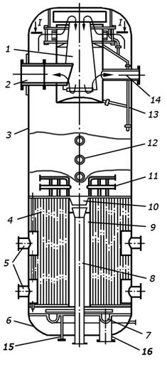 Раствор, поступивший в аппарат через патрубок 16, направляется кольцевым распределителем 7 в кипятильные трубки. Выброшенный из кипятильных трубок на верхнюю трубную решетку раствор стекает по направляющей воронке 10 в раствороотводящую трубу 8. Так как последняя вследствие гидравлического сопротивления или соответствующего регулирования потока не может пропустить все количество раствора, часть раствора стекает по циркуляционной трубе 9 и вновь поднимается по кипятильным трубкам.