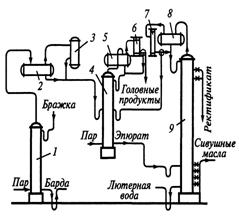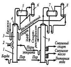 Очищенный от головных примесей спирт, содержащий хвостовые и промежуточные примеси (эпюрат), в жидком виде поступает в ректификационную колонну 9, снабженную дефлегматором 8 и конденсатором 7. Отбор спирта-ректификата, сивушного масла и промежуточных продуктов производится так же, как и в аппаратах прямого действия.