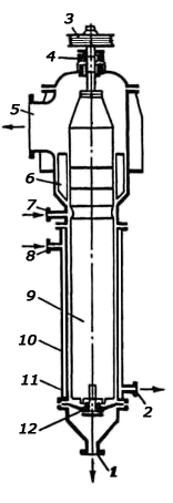 Аппарат состоит из цилиндрического корпуса 10 с рубашкой для обогрева 11. Верхняя часть корпуса имеет больший диаметр и служит сепаратором 6. Внутри корпуса расположен вращающийся ротор 9 в виде полой многоугольной призмы с вогнутыми боковыми поверхностями. Верхний конец вала ротора крепится в подшипниковом узле, находящемся над верхней крышкой. Место выхода вала ротора герметизируется сальником или торцевым уплотнением 4. Нижний конец вала ротора крепится в подшипниковом узле 12, расположенном внутри испарителя. Ротор приводится во вращение от электродвигателя через клиноременную передачу 3 и редуктор.