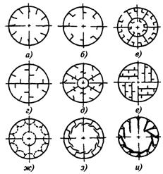 Внутри барабана установлены различного типа насадки (рис. 4.18), способствующие повышению эффективности процесса сушки. Конструкции насадок (внутренних устройств) выбираются в соответствии с требованиями технологического процесса (подъемно-лопастные – а, б, в; распределительные – д, е; концентрические – в, з; перфорированные – г, ж; канальные – ж, з, и и др.) Основной характеристикой сушильного барабана является его влагонапряжение по испаренной влаге A = 6…44 кг/(м3·ч), величина которого зависит от степени заполнения и частоты вращения барабана, теплофизических свойств и размеров продукта, а также от температуры, влажности и скорости движения сушильного агента.
