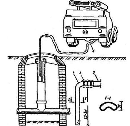 Для этого изготовляется специальный зонд (1) из тонкостенной трубы диаметром 51 мм. Его длина два метра, сечение в поперечном разрезе напоминает полумесяц, что позволяет свободно перемещать его между каналами гидранта. На входном конце зонда закреплен четырехметровый пожарный рукав и соединен соединительной головкой (4) с трубой выхлопа.