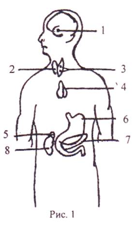 . На рисунке цифрами показаны некоторые железы человека, а в нижеприведенных утверждениях указаны некоторые функции, связанные с этими железами. Соотнесите номер с номером соответствующего утверждения.