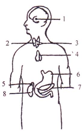 . На рисунке цифрами показаны некоторые железы человека, а в нижеприведенных утверждениях указаны некоторые функции, связанные с этими железами. Соотнесите номер с номером соответствующего утверждения.