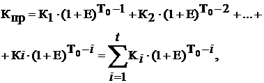При определении эффективности инвестиционного проекта предстоящие затраты (3) и результаты (R) оцениваются в пределах расчетного периода. При этом разновременные показатели соизмеряются методом дисконтирования, т. е. путем приведения их к денежным средствам в начале авансирования единовременных затрат. За весь период осуществления единовременных затрат их приведенная величина определяется по формуле: