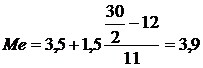 Найдем медианный интервал. Таким интервалом будет интервал доходов бюджета регионов (3,5-5 млн. руб.), поскольку его накопленная частота равна 23 (11+7+5), что превышает половину суммы всех частот (30:2=15). Нижняя граница интервала 3,5 млн. руб.. его частота 11; частота накопленная до него, равна 12.