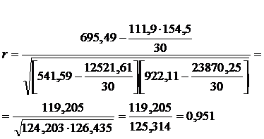 Т. к. коэффициент корреляции (r = 0,951) близок к единице, значит связь между признаками тесная, прямая.