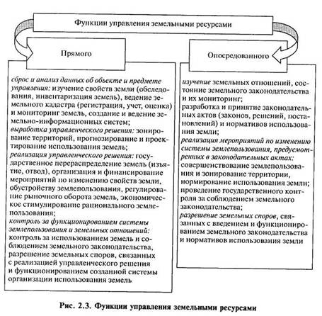 Управляют земельными ресурсами по двум направлениям: прямому и опосредованному. Первое связано с созданием конкретных форм и условий землепользования (пространственные характеристики земельных участков, размещение инженерных сооружений, поселений, производственных и рекреационных центров, изменение состояния земель) и имеет дискретный характер. Второе определяет рамки (пределы) в использовании земли, создавая нормативно-правовую базу (рис. 2.3). Опосредованное управление в отличие от прямого осуществляют постоянно.