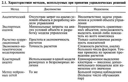 В представленном алгоритме принятия решения могут быть приняты следующие условия: задача — достижение максимального результата, определяемого целью управления, при оптимальном расходовании всех используемых ресурсов; критерии: увеличение доходной части бюджета; экономия бюджетных средств; снижение затрат времени; показатели: затратные; доходные; период сбора информации: месячный; квартальный; годовой; пятилетний; по необходимости; методы исследования: аналитический; экспертных оценок; корреляционно-регрессионный; кластерный анализ; метод нейронных сетей; экономико-математическое моделирование и др. Результаты анализа методов, которые могут быть использованы при постановке задачи и определении эффективности управленческих решений, приведены в таблице 2.1.