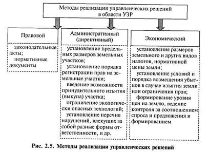 - реализацию управленческого решения: государственное перераспределение земель (изъятие, отвод), организацию и финансирование мероприятий по изменению свойств земли, обустройству и оформлению землепользовании, регулирование рыночного оборота земель, экономическое стимулирование рационального землепользования;