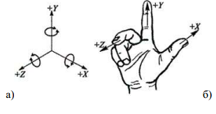 Рисунок 7 – а) – расположение осей координат в станках с ЧПУ; б) – правосторонняя система координат