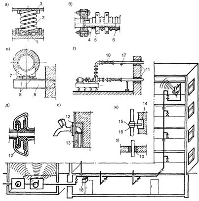 Максимальное уменьшение шума может быть достигнуто комплексным использованием активных и пассивных методов. Устройства для борьбы с шумом показаны на рис. 18. Насосные агрегаты (рис. 18, г) устанавливают на массивные фундаменты, которые опираются на пол через пружинные амортизаторы. Для эффективной изоляции амортизаторы (рис. 18, а) состоят из пружин, которые через шайбу опираются на перфорированные резиновые прокладки. Применение песчаной прокладки между фундаментом насоса и строительными конструкциями также способствует снижению уровня шума. Для уменьшения вибраций, передаваемых от насосного агрегата к трубам, используют гибкие вставки (рис. 18, б) из армированного резинового шланга длиной 1 м, закрепляемого на патрубках хомутами.