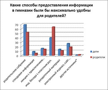 На вопрос, какие способы представления информации гимназией о ходе образовательного процесса были бы максимально удобны для родителей, были получены ответы: