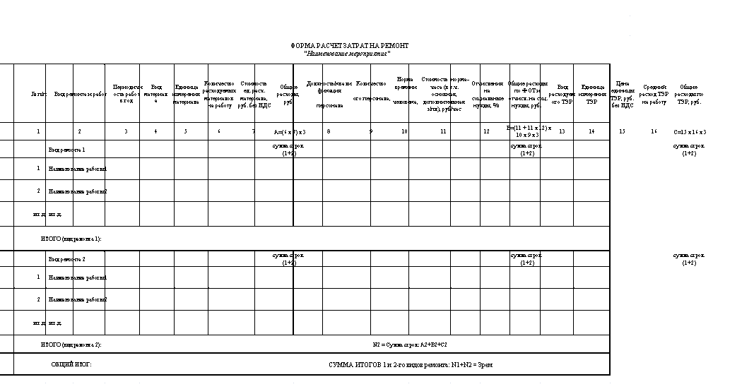 № п/п | Вид оборудования | Периодичность работ в год | Вид материала | Единица измерения материала | Количество расходуемых материалов на работу | Стоимость ед. расх. материала, руб. без НДС | Общие расходы, руб. | Должность/квалификация задействованого персонала | Количество задействованого персонала, чел. | Норма времение на 1 человека, нормо-час | Стомость нормо-часа (в т. ч. основная, дополнительная з/пл), руб/час | Отчисления на социальные нужды, % | Общие расходы по ФОТ и соц. нуждам, руб. | Вид расходуемого ТЭР | Единица измерения ТЭР | Цена единицы ТЭР, руб. без НДС | Средний расход ТЭР в час | Общие расходы по ТЭР, руб. |