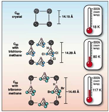 Новый рекорд критической температуры сверхпроводящего перехода в фуллеритах установлен в Bell Labs.: расширяя решетку С60 введением CHBr3 в монокристаллы и инжектируя носители через полевой электрод, удалось получить Тс=117К (длина когерентности составила два межмолекулярных расстояния) для концентрации носителей 3-3.5 на молекулу С60. В другом кристалле - CHCl3/C60, при инжекции носителей с той же концентрацией достигнута Тс=80К. Измеренные параметры решеток составили 14.45Å и 14.29Å, соответственно.