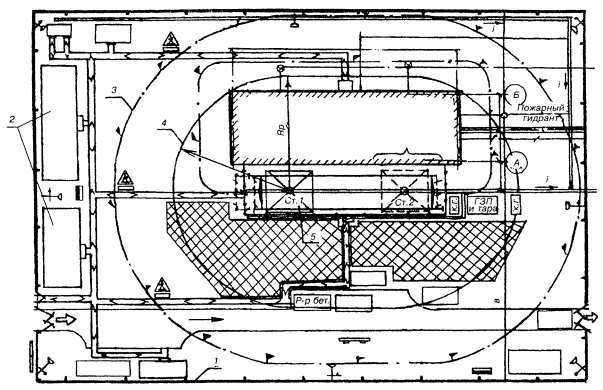 1 - ограждение строительной площадки; 2 - санитарно-бытовые помещения; 3 - граница зоны, опасной для нахождения людей во время перемещения грузов; 4 - граница зоны обслуживания краном; 5 - башенный кран