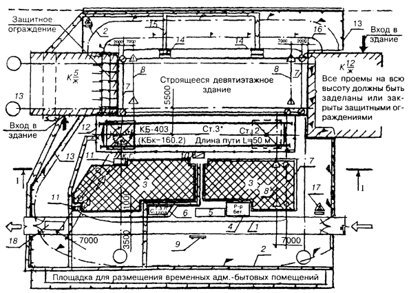1 - граница зоны обслуживания краном; 2 - граница опасной зоны от действия крана; 3 - зона складирования грузов; 4 - площадка приема раствора и бетонной смеси; 5 - стоянка транспорта под разгрузкой; 6 - место хранения грузозахватных приспособлений и тары; 7 - линия ограничения зоны обслуживания; 8 - линия предупреждения об ограничении зоны обслуживания; 9 - стенд схем строповок; 10 - шкаф электропитания крана; 11 - контрольный груз; 12 - ограждение крановых путей; 13 - временный забор; 14 - навес над входом в здание; 15 - пешеходная дорожка; 16 - граница опасной зоны от строящегося здания; 17 - знак, предупреждающий о работе с пояснительной табличкой; 18 - пункт мойки колес автотранспорта