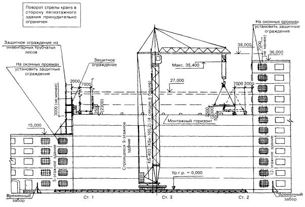 Примером этому может служить пристройка здания к существующему, когда строящееся здание имеет высоту большую, чем существующее. В этом случае нельзя допустить, чтобы груз перемещался над перекрытием эксплуатируемого здания. Для этого на перекрытии эксплуатируемого здания собирается защитный экран в виде стоечных лесов, высота которого должна превышать высоту монтажного горизонта и препятствовать выходу груза за контуры строящегося здания.