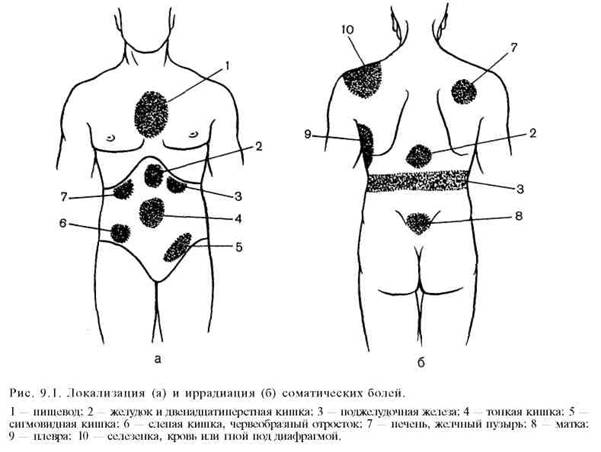 Локализация соматических болей соответствует месту раздражения париетальной брюшины (рис. 9.1). Они бывают режущими, жгучими, постоянными. Интенсивность соматических болей резко выражена при перфорации полого органа в свободную брюшную полость ("кинжальные" боли), при эмболии артерий и тромбозе сосудов брыжейки.