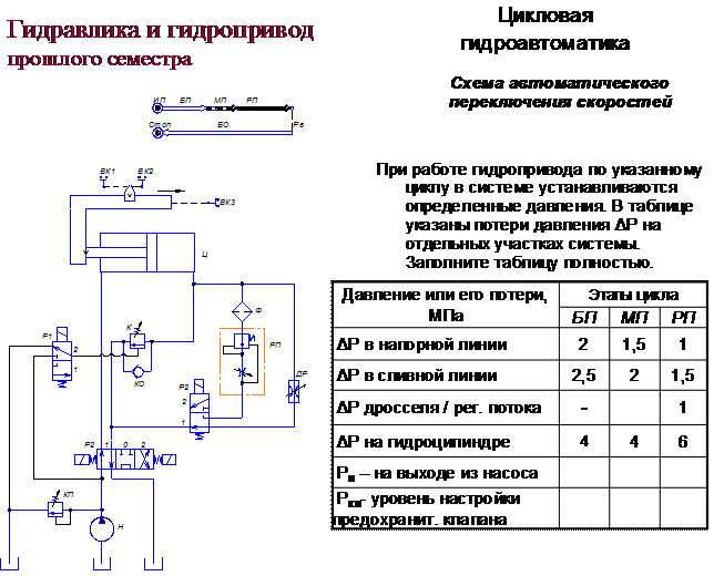 Поскольку материал первого раздела курса по следящему гидроприводу базируются на знаниях, полученных в предыдущем семестре по дисциплине "Гидравлика и гидропривод", то на первой лекции проводится тестовый контроль на понимание основ функционирования простого гидропривода с дроссельным регулированием скорости с последующим обсуждением результатов. Тест представлен ниже.