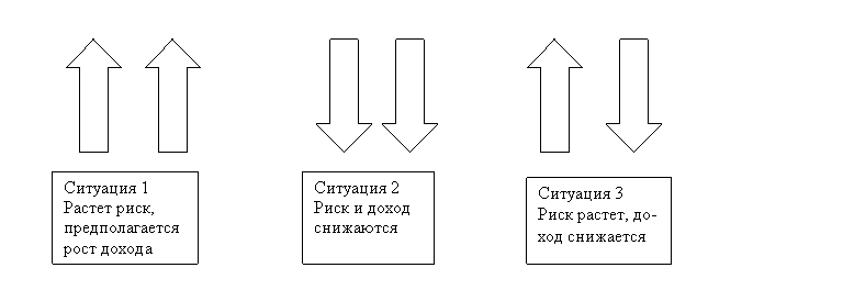 Анализируя взаимосвязь кредитного риска и величины дохода от кредитных операций, мы обнаружили различные формы проявления такой связи. В дополнение к общеизвестной, можно сказать классической ситуации, когда высокий уровень кредитного риска предполагает получение высоких процентных доходов, и соответственно, падение доходности выполняемых операций имеет место при низком кредитном риске, нами обнаружено противоречие, проявляющееся в том, что имеет место ситуация, когда возрастающий риск влечет за собой падение доходности кредитных операций. Схемы ситуаций представлены на рис. 2.