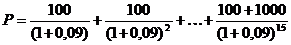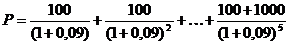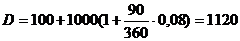 Срок до погашения облигации - 90 дней, номинал - 1000 рублей, сумма по последнему купону (выплачивается в момент погашения облигации) составляет 100. Определите текущую стоимость облигации, если ставка дисконтирования равна 8 % годовых (формула простых процентов), дней в году - 360.