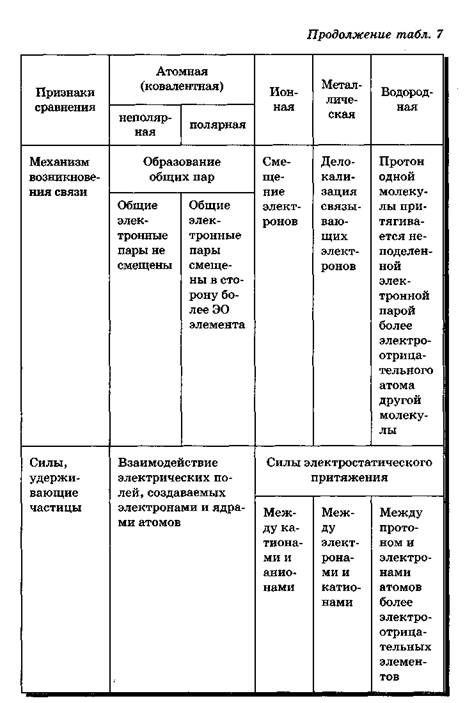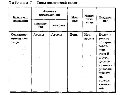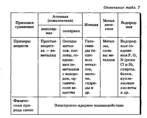 Причиной единства всех типов и видов химических связей служит их одинаковая физическая природа — электронно-ядерное взаимодействие. Образование химической связи в любом случае представляет собой результат электронно-ядерного взаимодействия атомов, сопровождающегося выделением энергии (табл. 7).