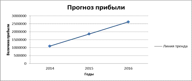 Из графика видно, что если предприятие сумеет сохранить существующую динамику производства товаров и услуг, то прогнозируемая прибыль на 2016 год составит 2620000 тыс. руб.
