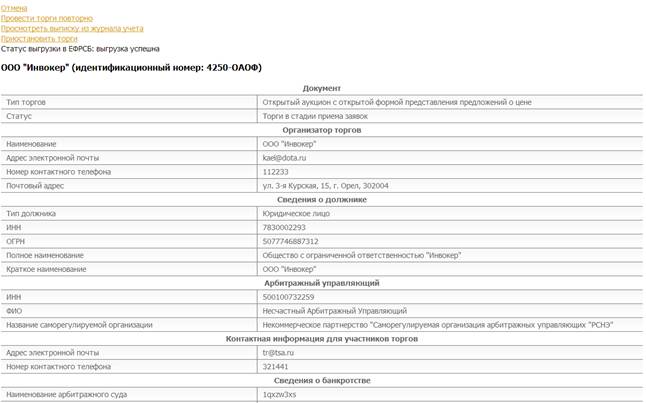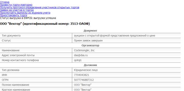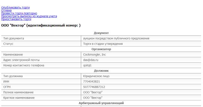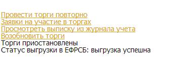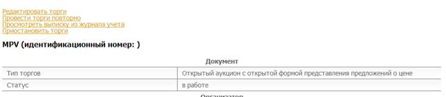 При необходимости организатор торгов может приостановить торги или отказаться от проведения торгов. Для этого необходимо кликнуть по соответствующей ссылке в верхнем меню на информационной карте торгов, как представлено на рис. 5.12 (перейти к информационной карте можно из Личного кабинета).