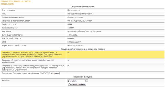 При нажатии на нужную строку в таблице откроется страница, представляющая выбранную заявку на участие в торгах. На этой странице можно просмотреть информацию о заявке и приложенные документы и сделать выбор допуска на участие в торгах или отказа в допуске к торгам (рис. 5.6).