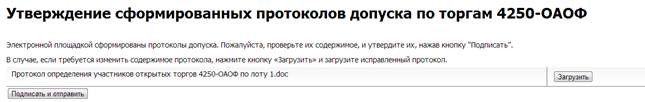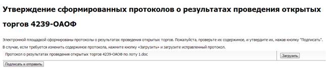 При нажатии на кнопку «Получить протокол о результатах проведения торгов» открывается страница «Утверждение сформированных протоколов о результатах торгов», на которой необходимо проверить содержание сформированных документов и утвердить их с помощью ЭЦП.